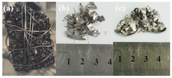 (a) Ti scrap before the electrolytic deoxidation process; (b) external and (c) internal Ti scraps after the process.