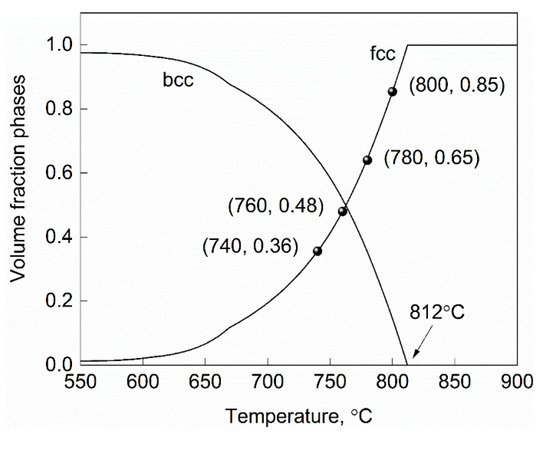 Temperature–volume fraction phase diagram of experimental steel; bcc and fcc stand for body-centered cubic and face-centered cubic, respectively.