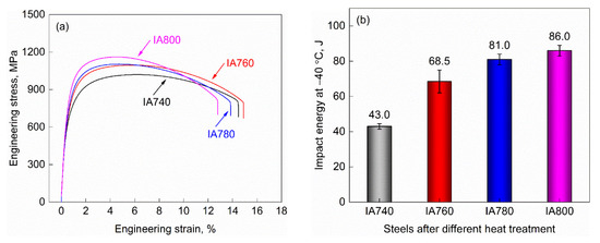 Mechanical properties of the steels annealed at different temperatures: (a) engineering stress-strain curves and (b) Charpy impact energy at −40 °C.