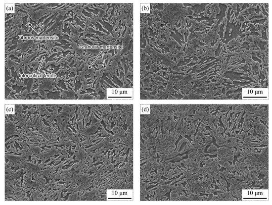 The microstructure of the steels annealed at different temperatures characterized by SEM is depicted in Figure 3. After intercritical annealing, a heterogeneous microstructure of intercritical ferrite and martensite was obtained. The martensite can be classified into granular martensite and fibrous martensite according to its morphology, which was derived from the different reversed austenite. When annealed at the (α + γ) region, globular reversed austenite is formed at the prior austenite grain boundaries as well as martensite packet and block boundaries, and acicular reversed austenite is formed at martensite packet, block, or lath boundaries [28]. These two types of reversed austenite would be transformed to granular martensite and fibrous martensite during the cooling process, respectively. The fraction of those newly formed martensite increased with increasing annealing temperature. The microstructure of IA740 and IA760 steels was dominated by intercritical ferrite, whereas the leading microstructure in IA780 and IA800 steels was newly formed martensite.