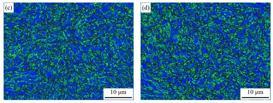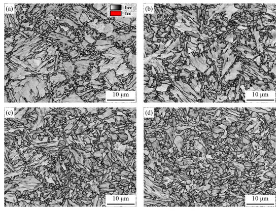 Band contrast (BC) maps showing the boundary distribution of the steels annealed at different temperatures: (a) IA740, (b) IA760, (c) IA780, and (d) IA800.