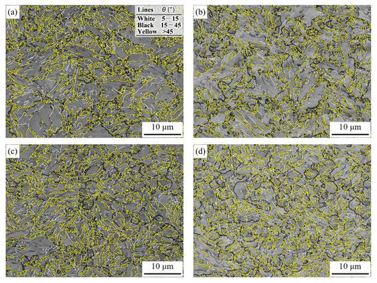 Band contrast maps showing the boundary distribution of the steels annealed at different temperatures are depicted in Figure 5. The boundaries were divided into three types according to the misorientation (θ) and highlighted by lines with different colors, i.e., white (5° < θ < 15°), black (15° < θ < 45°), and yellow (θ > 45°). It was found that the interfaces of globular reversed austenite were high angle grain boundaries (HAGBs) with misorientation between 15° and 45°, and the HAGBs with misorientation greater than 45° were dominant inside the globular reversed austenite grains. The size of globular reversed austenite grains gradually increased with an increase in annealing temperature, resulting in a significant increase in density of HAGBs (θ > 15°). The steels annealed at higher temperatures (780 and 800 °C) exhibited higher density of HAGBs (θ > 15°) than the steels annealed at lower temperatures (740 and 760 °C). Clearly, the globular reversed austenite grew significantly when annealed at higher temperatures, which is beneficial to the refinement of the coarse prior austenite grains.