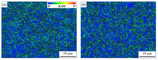 Figure 7 shows the KAM distribution of the steels annealed at different temperatures. It is noted that the KAM value of the steels was mainly distributed in a range of 0–2.0° and the peak fraction of KAM value appears near 0.5° (Figure 7a). The distribution peak of KAM values became lower as the annealing temperature increased, and the fraction of KAM value in the range of 0.5–1.5° became higher (Figure 7b). This suggested that the dislocation density in the matrix was increased with annealing temperature and the distribution was more uniform in the steels annealed at higher temperatures.