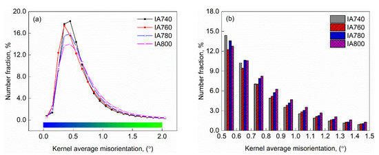 The Kernel average misorientation (KAM) maps of the steels annealed at different temperatures are shown in Figure 6. The KAM can represent the density distribution of local dislocations that are related to geometrically necessary dislocations [29]. Thus, the change in dislocation density of the steels can be revealed by KAM distribution. In IA740 steel, a remarkable KAM variation was observed in the granular martensite, fibrous martensite, and intercritical ferrite. It is obvious that the granular martensite exhibited high KAM values. The areas with high KAM values inside the large grains were fibrous martensite, whereas the areas with low KAM values were intercritical ferrite. This indicates that the dislocations are heterogeneously distributed in the microstructure. With the increase in annealing temperature, the areas with high KAM values increased gradually. Compared with IA740 and IA760 steels, the areas with high KAM values in IA780 and IA800 steels were larger and the distribution of KAM values was more uniform.