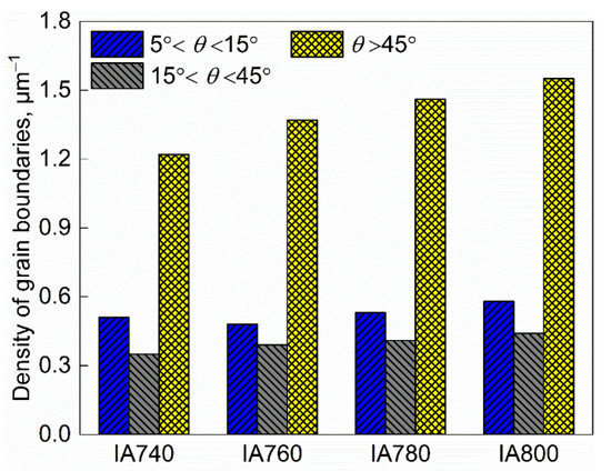Figure 10 shows the density of grain boundaries in the steels annealed at different temperatures. It can be seen that the density of HAGBs (θ > 15°) increased gradually with increasing annealing temperature. The variation in the density of HAGBs (15° < θ < 45°) indicates that the prior austenite grains are refined gradually as the annealing temperature increased. The increase in the density of HAGBs (θ > 15°) is mainly associated with the formation of globular reversed austenite.