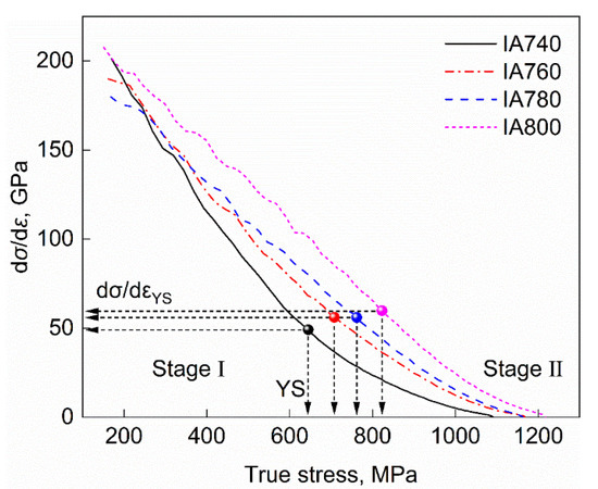 To reveal the strength variation and work hardening behavior of heterogeneous microstructure, the extended Kocks–Mecking (K–M) curves of the steels were analyzed, as shown in Figure 12. The extended K–M curve shows the relationship between the work hardening rate (dσ/dε) and the true stress. Before reaching the tensile strength, the change of the work hardening rate can be divided into two stages, separated by the yield point [34]. The first stage is an elastic deformation stage caused by the anelastic reversible behavior for the bowing of matrix dislocations (Stage I), and the second stage is a plastic deformation stage associated with the effective accumulation of dislocations (Stage II). It is found that the steels annealed at different temperatures showed continuous yielding behavior and high initial work hardening rate. The deformation behavior of the steels at initial stage is associated with the residual stress and geometrically necessary dislocations (GNDs) in the intercritical ferrite. The residual stresses are considered to be responsible for lowering the yield strength, whereas the unpinned GNDs contribute to the continuous initial yielding [35]. As a result, a rapid work hardening at the early stage of deformation was observed. With the increase in annealing temperature, the ultimate tensile strength and work hardening rate at each stress increased, which were mainly related to the volume fraction of martensite. It has been shown that the work hardening rate of the steels with heterogeneous microstructure is related to [36], where VM is the volume fraction of martensite and DM is the average diameter of martensite islands. At a given DM, the work hardening capability will be enhanced by increasing the VM. In this study, the volume fraction of martensite increased significantly with increasing annealing temperature, but the size was almost the same, thus the work hardening rate increased.