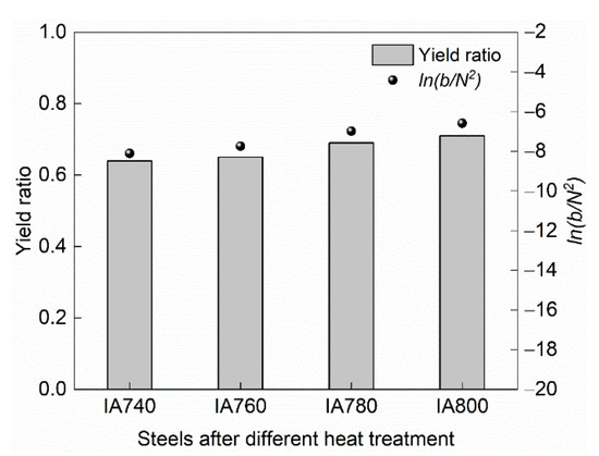 It was reported that the yield ratio is approximately proportional to ln(b/N2) by simplifying Equation (1) [26]. Figure 13 shows the experimental yield ratio and estimated ln(b/N2) value of the steels annealed at different temperatures. The yield ratio can be effectively lowered by creating heterogeneous microstructure through introducing intercritical ferrite to a single martensite microstructure [4,27]. Thus, the steels annealed at different temperatures exhibited low yield ratio. In addition, the fraction of martensite increased with increasing annealing temperature. As a result, the b value increased and the N value decreased, resulting in the increase in the ln(b/N2) value and yield ratio. It can be inferred that the reduction of the yield ratio can be achieved through modifying the fraction of martensite in the heterogeneous microstructure by decreasing the value of b or increasing the value of N.