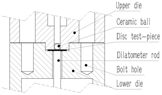 Cross-sectional view of the testing rig in a small-punch-creep-test setup.