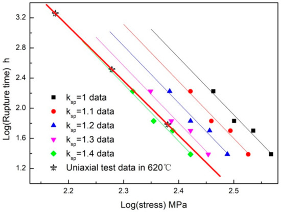By using the above formula, the dependence of the rupture time, tr, on the loading stress (σ) both in the conventional uniaxial creep test and small punch test at 620 °C is given in Figure 4. By setting different values of ksp between 1.0 and 1.4, five groups of SPT data are shown in the figure. As can be seen, the dependences in both sets of data can be described by the power-law relationships given by Equation (2):