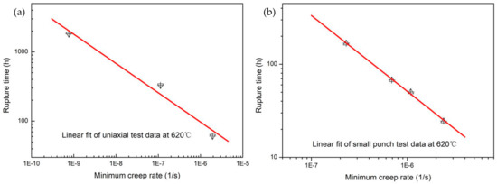 By using the above formula, the minimum deflection rate, , can be related to the minimum creep rate, ; thus, the dependence of the rupture time on the minimum creep rate (or converted creep rate for SP deflection) for the uniaxial test and small punch test at 620 °C can be plotted in Figure 5. It can be seen that there is a good linear relationship in the double logarithmic coordinates between rupture time and minimum creep rate for both sets of data, meaning that the creep data fit in well with the Monkman–Grant relation both in the uniaxial creep test and in the small punch creep test.