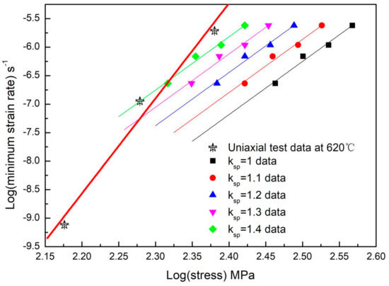 The dependence of on the creep stress or predicted stress, σ, in the conventional uniaxial creep test and small punch test at 620 °C is plotted in Figure 6. By setting different values of ksp between 1.0 and 1.4, five groups of stress values predicted by SPT load data are shown in the Figure 6. As can be seen, the relationship between the minimum creep rate and creep stress shows a similar manner to those in Figure 3, and they can also be described by the power-law relationship given by Equation (4):