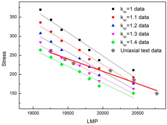 According to Equation (5), LMPs in each load level for small punch tests and uniaxial tests are calculated and plotted in Figure 7. It can be seen that LMPs increase linearly as creep stress decreases in both loading conditions, which means that TTPs method can also be applied to small punch test. By comparing the two sets of data, it is found that in range of high stress values there is a good agreement between the two sets of data using ksp = 1.3–1.4, while ksp = 1.0–1.2 can make a good prediction in low-stress values. In a wide range of creep stress, a conservative prediction can be obtained by using ksp = 1.4.