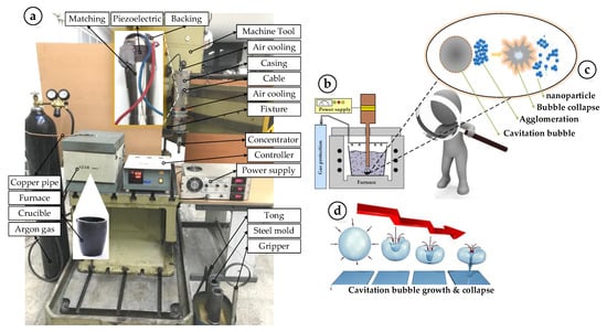 - Yang, Y.; Li, X. Ultrasonic Cavitation-Based Nanomanufacturing of Bulk Aluminum Matrix Nanocomposites; ASME: New York, NY, USA, 2007. [Google Scholar]