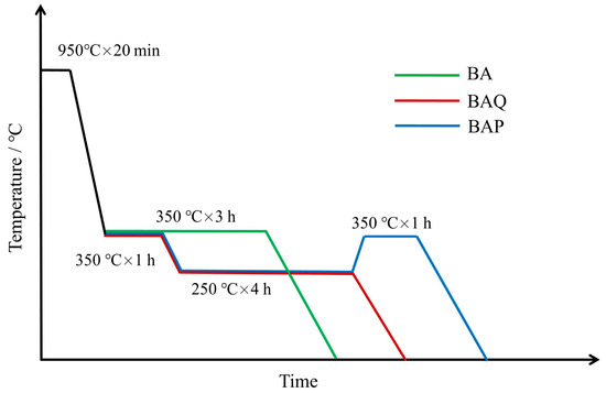 Schematic graph of BA (bainitic austempering), BAQ (bainitic austempering-quenching), and BAP (bainitic austempering-partitioning) treatments.