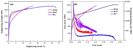 The stress and strain curves of the BA, BAQ, and BAP, and corresponding work hardening rate curves are shown in Figure 2, and the data are listed in Table 1. The BA sample had the lowest yield strength, and both the ultimate strength and yield strength of the BAP sample are slightly higher than that in BAQ in Figure 2a. Furthermore, the elongation is significantly larger and almost twice the value in the BAP sample compared to the BA and BAQ in Table 1. However, the strain hardening capacity of the BAP showed a lower value than the BA and BAQ until fracture as shown in Figure 2b.