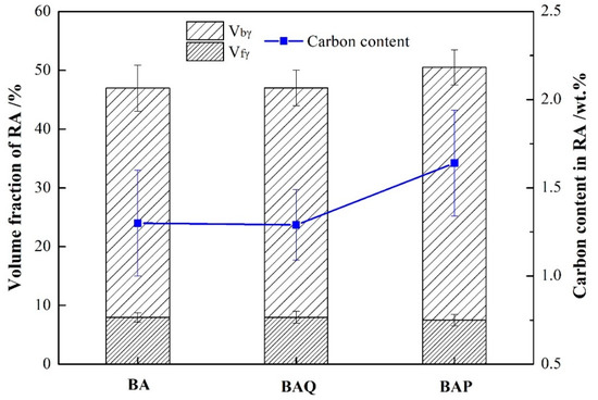 In Table 3, in the BAP sample was much lower than BAQ which was resulted from the lower dislocation density. Tempering at 350 °C for 1 h, the dislocation density in BAQ had recovered and the carbon in dislocation or Cottrell atmosphere was released from defects and diffused into RA. Herein, the different could be contributing to the increase of carbon content in RA. Therefore, it could be concluded that the increase of carbon content in RA in BAP mainly consisted of two parts: the dissolved carbon in bainitic ferrite and the trapped carbon in dislocation or Cottrell atmosphere. These carbon atoms were considered to diffuse into the RA at the stage of tempering.
