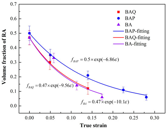The volume fraction of RA at different strains corresponding with the calculated fitting curves.
