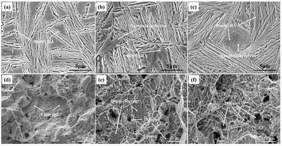 It shows that the microstructure consisted of plates of bainitic ferrite and RA in Figure 5. Furthermore, there were two different types of RA, such as block-shaped and film-shaped. The thin needle-like bainitic ferrite could be seen in blocky RA in Figure 5b,c. The nanobainite ferrite formed during austempering at 250 °C divided the blocky RA into smaller ones. The main fracture morphology of the BA and BAQ are quasi-cleavage, cleavage and dimples, whereas almost dimples are present in the BAP fracture, as shown in Figure 5d–f).