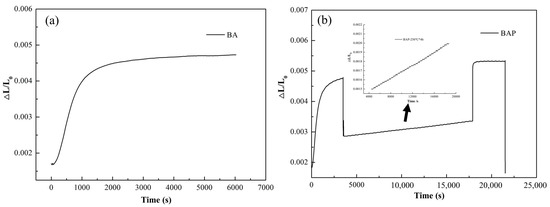 Figure 6 shows that the lengths changed in dilatometry tests for BA, and BAP samples. In Figure 6a, the length increased significantly before 1 h and then kept unchanged when the isothermal time exceeded 1 h at 350 °C, which means that the bainite transformation has been stasis in 1 h. Afterward, the length increased slightly once the isothermal temperature decreased to 250 °C for 4 h in Figure 6b. Furthermore, the length stayed flat during tempering at 350 °C for 1 h in Figure 6b.