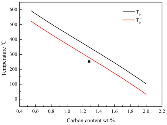 The relative length change during the partitioning and tempering could be attributed to carbon partitioning and phase transformations. It is reported that the bainite transformation would be stasis when the carbon content in RA exceeded the T0 line (T0′ was considered the stored energy in ferrite) [5]. The whole heat treatment process of BAP could be divided into three stages: (i) at 350 °C for 1 h. The transformation had been sluggish when time exceeds 1 h at 350 °C; (ii) at 250 °C for 4 h. The nanoscale bainite ferrite continued to form once decreasing the isothermal temperature to 250 °C in Figure 6b. This was because the driving force increased when the isothermal temperature decreased from 350 °C to 250 °C, and then triggered the bainite transformation again. Furthermore, the RA can accommodate more carbon atoms when decreasing isothermal temperature, which is shown in Figure 7. (iii) tempering at 350 °C for 1 h. The carbon concentration was 1.29 wt.% and 1.30 wt.% in BAQ and BA samples, respectively, which are marked in the black dot in Figure 7. The transformation would stop when the carbon content in RA reached the T0′ line based on diffusionless theory. And the length change stayed almost flat in Figure 6b, which indicates that no phase transformation occurred.