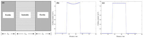 (a) the relative position in calculation system (LA = 20 nm, LF = 15 nm), (b) the carbon distribution at t = 0.0001 s, (c) the carbon distribution at t = 0.001 s.