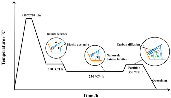 Bhadeshia [7] found that steel with a high carbon content (≥0.6 wt.%) could form a microstructure of nanosized bainitic ferrite and RA when austempering at a low temperature for a couple of days. The ultimate strength exceeds 2 GPa with a considerable toughness, which shows great potential for industrial application. It has been reported that the nanostructured bainitic ferrite continues to form when adopting multi-step heat treatments. It can divide the blocky RA into smaller ones and improve its mechanical stability [8,9]. However, the time of heat treatment lasts long.