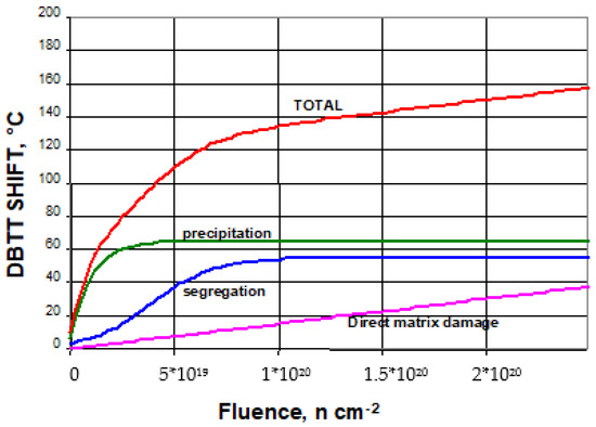 The most severe requirement for the RPV steels is the irradiation toughness. Neutron irradiation causes three types of damage in the structural materials: precipitates and segregations occur, and the lattice can be damaged. The sum of the effect of these three mechanisms gave the embrittlement, as can be seen in Figure 1 [4]. The total value describes the transition temperature increase in the function of the fluence (neutron irradiation dose). This curve determines the lifetime of the pressure vessel. If one element initiating segregation clusters is depleted in the matrix, other ones may initiate new types of segregations. Copper precipitations are the first, but later Ni–Mn precipitates became the major players. This is called late blooming, since the second type of precipitates may accelerate the embrittlement and deform the total curve in Figure 1. [5]. If the DBTT shift reaches a critical value (calculated for each unit) the vessel safety level becomes too low to operate it.