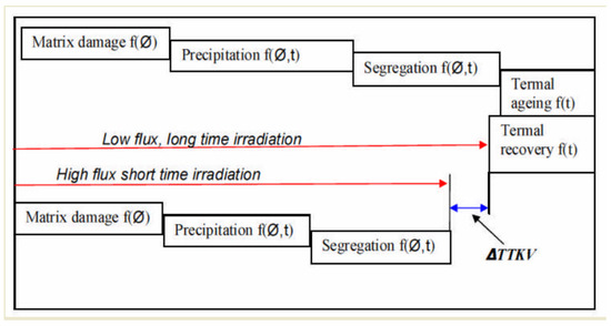 Summary of the RPV ageing mechanisms and comparison of high- and low-flux irradiation at low temperature (≤350 °C). At high-flux irradiation (in accelerated research facilities) the time is short for finishing the diffusion processes, and the role of thermal ageing and thermal recovery (annealing) is negligible. At higher temperature, the diffusion accelerated, and thermal annealing may reduce the radiation embrittlement [7].