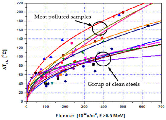 The effect of P was greatest when Cu content is low (<0.1%). The sensitivity of the changes of the mechanical properties caused by the P content reduced as the Cu content raised. At Cu ≤ 0.1 wt%, research confirmed the significant effect of P-content over 0.003 wt% [16]. The average increase in the transition temperature was 20–30 °C for each 0.01 wt% of P for a Cu content of about 0.05 wt% and neutron fluence 0.5–7.1019 n/cm2 E ≥ 1 MeV.