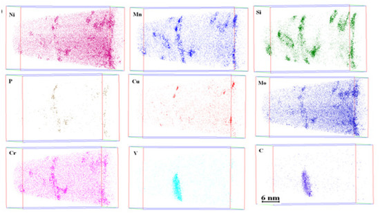 APFIM results of highly irradiated (6.19 × 1020 n/cm2, E > 1 MeV) Cr–Mo–V steel. Stronger colors mean increased density. Cu precipitations occur first and the other elements join to it forming clusters. Vanadium carbides occurred still in the foundry, but during irradiation other alloying and polluting elements join to them. It is also can be seen that that many clusters are not Cu but Mn based.