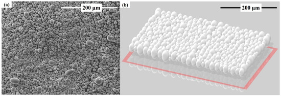 Many powder particles fall and generate a powder bed at the beginning of the powder development and deposition process. For powder particles, an interactive method based on the nonlinear Hertz–Mindlin elastic equation [49] measures the actual elastic contact force between the particles. Mechanical energy dissipation is also taken into consideration when computing the damping factor [50,51,52]. Among these interacting particles, the perpendicular contact force and damping force naturally occur. The relative stiffness of the plane is uniformly perpendicular throughout the whole plane. In addition, the mass and Young’s modulus are interchangeable. No micro-slip method is employed in the tangential route to deal with the elastic contact force [49]. AlSi10Mg powder particles were deposited using the Flow Science, Discrete Element Modelling (DEM) module from Flow Science, USA. This module allows the user to simulate the powder layer based on the particle size distribution (PSD) and the corresponding packing density. Hence, the powder layer was developed using micro-particles with a diameter of just a few microns with a packing density equal to 63%. Particle size distribution acquired by SEM versus software is shown in Figure 1a,b, respectively. It is worthy to mention that SEM was used to determine the powder particles’ morphology. For simulation, the PSD was used as an input to compute the powder layer formation.