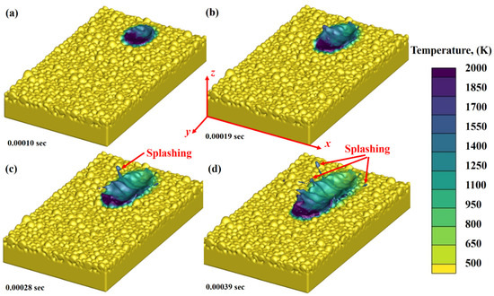 Melt pool splashing in LPBF printing of AlSi10Mg alloy at various time intervals: (a) 0.00010 s, (b) 0.00019 s, (c) 0.00028 s and (d) 0.00039 s.