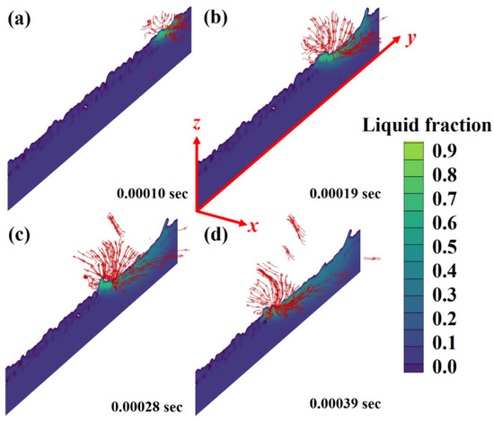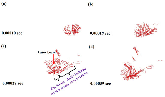 Stream traces were used to identify the melt flow pattern and splashing within the melt pool. These results have been shown in Figure 4a–d for different time zones, including 0.00010 s, 0.00019 s, 0.00028 s and 0.0039 s, respectively. From the results, it can be identified that the melt flow usually follows a clockwise vortex ahead of the laser spot while an anti-clockwise vortex behind the laser spot.
