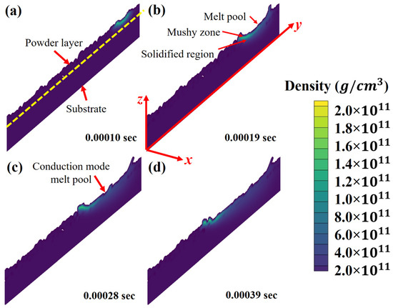 Figure 6a–d shows the material’s density change and melt flow mode across the cross-section along the y-axis at various time domains at 0.00010 s, 0.00019 s, 0.00028 s and 0.0039 s, respectively. The melt flow patterns can be classified into (a) conduction mode (CM) and (b) depression mode (DM) [67,68]. In CM, the material is heated from the top. The laser energy employed is usually higher than the heat loss rate that surpasses the material’s melting temperature, resulting in melt pool formation. The possibility of material vaporization lies in both CM and DM [69]. However, the material vaporization probability is very high in the case of DM exists at a higher laser energy density [70]. During laser printing, the bubbles escape from the melt pool and result in porosity if the solid front hits quickly before their escape. It is worth mentioning that the pores formation probability is much higher in DM than the CM due to higher energy density utilization in the case of DM. For AlSi10Mg, the laser beam absorptivity is only 18% [19]. The CM will transform into DM if the laser energy density absorption becomes significantly high. However, in this study, only CM has been identified. Furthermore, the simulation results presented three regions: (a) melt pool, (b) mushy zone and (c) solidified regime. The melt pool’s multi-physical dynamics and thermal distribution determine and control the microstructure evolution and corresponding mechanical-physical characteristics. The control of melt pool dynamics will ultimately assist in controlling the part’s characteristics at the layer level.