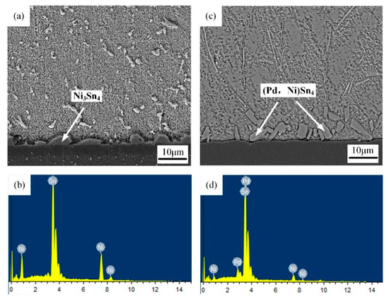 - Baek, Y.H.; Chung, B.M.; Choi, Y.S.; Choi, J.H.; Huh, J.Y. Effects of Ni3Sn4 and (Cu,Ni)6Sn5 intermetallic layers on cross-interaction between Pd and Ni in solder joints. J. Alloys Compd. 2013, 579, 75–81. [Google Scholar] [CrossRef]