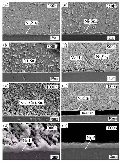 - Sun, P.; Andersson, C.; Wei, X.C.; Cheng, Z.N.; Shangguan, D.K.; Liu, J. High temperature aging study of intermetallic compound formation of Sn-3.5Ag and Sn-4.0Ag-0.5Cu solders on electroless Ni(P) metallization. J. Alloys Compd. 2006, 425, 191–199. [Google Scholar] [CrossRef]