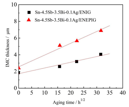 - Yoon, J.W.; Lee, C.B.; Jung, S.B. Growth of an intermetallic compound layer with Sn-3.5Ag-5Bi on Cu and Ni-P/Cu during aging treatment. J. Electron. Mater. 2003, 32, 1195–1202. [Google Scholar] [CrossRef]