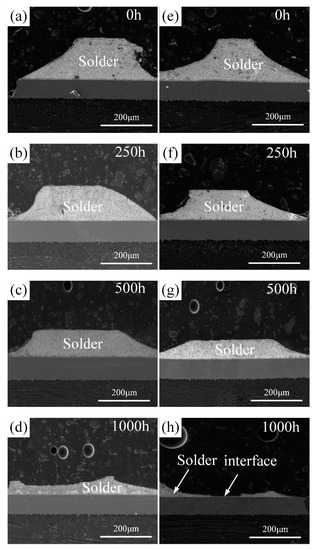 - Yoon, J.W.; Noh, B.I.; Jung, S.B. Comparison of Interfacial Stability of Pb-Free Solders (Sn-3.5Ag, Sn-3.5Ag-0.7Cu, and Sn-0.7Cu) on ENIG-Plated Cu During Aging. IEEE. Trans. Compon. Packag. Technol. 2010, 33, 64–70. [Google Scholar] [CrossRef]