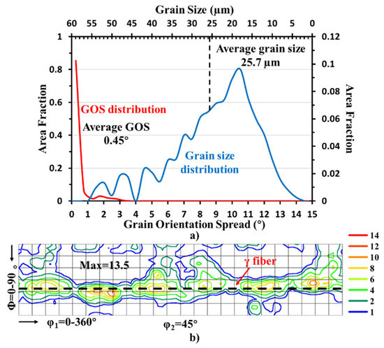 The non-oriented silicon steel with a thickness of 0.5 mm studied in this paper was produced by China Baowu Iron and Steel Group Co., Ltd. (Wuhan, China), and is commonly used in motor cores, under the brand name 50WW1300. Table 1 shows its nominal chemical composition and mechanical properties obtained with tensile tests on standard samples prepared in rolling direction (RD) and transversal direction (TD) of a silicon sheet. For this type of silicon steel, the mechanical properties are almost identical in RD and TD. The average grain orientation spread (GOS) of the initial material is 0.45°, which is less than 1° and indicates this material is completely recrystallized (Figure 1a). The average grain size of this material is about 25.7 µm, and it is textured with a complete γ {111} fiber as the main component (Figure 1a,b).