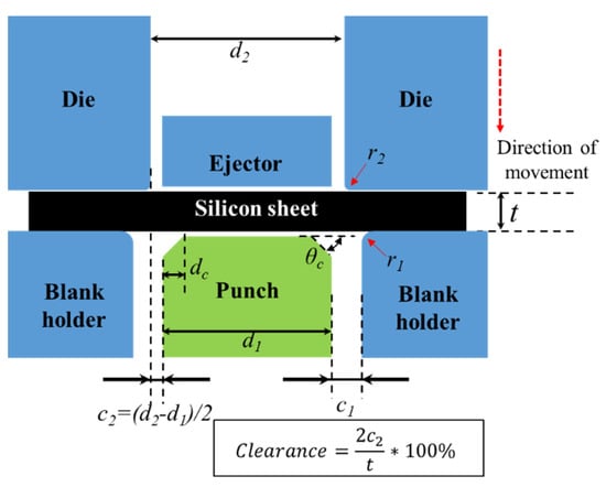 Geometric illustration of the punching experiment. ( is the radius of the punch; is the inner diameter of the die; is the chamfer distance of the punch; is the chamfer angle of the punch; is the fillet radius of the blank holder; is the fillet radius of the die; is the difference value in radius between the punch and blank holder; is the difference value in radius between the punch and die; is the thickness of the silicon sheet).