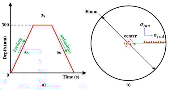 The Suresh theoretical model is mainly used to quantify surface residual stress, and is based on the assumption that equibiaxial residual stresses exist on the surface layer of the sample [12]. In this study, we assumed that the residual stresses in the radial direction and the tangential direction ( and in Figure 3b) of the studied sample were equivalent for each test point, and these two stress components were considered equal in value as analyzed by nanoindentation test. In addition, the average nominal error of residual stress analysis was less than 25 MPa for most of the test points.