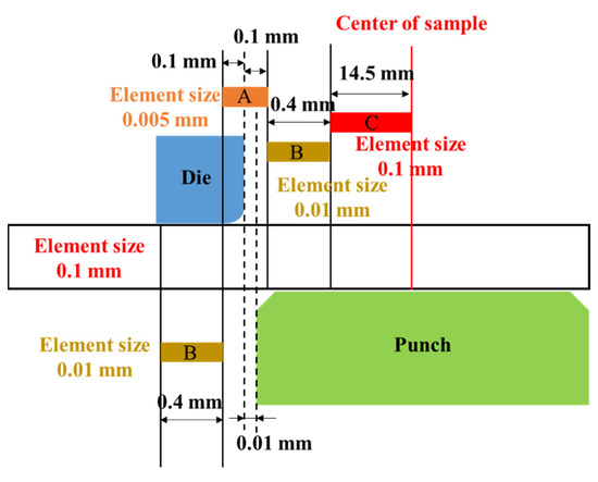 The punching process causes always large deformation at the cutting edge, which will lead to a large mesh distortion during the FE simulation. Therefore, the four node bilinear axisymmetric quadrilateral elements with reduced integration (CAX4R) were used for the mesh generation. From the cutting edge to the center of sample, three grades of element size were selected (Figure 4). Considering the high strain gradients in the cutting region, and the small distance between punch and die, the element size was chosen as 5 µm for the area A, which was very close to the cutting edge. Moreover, the punch, die and holder were represented as 2D analytical rigid bodies.