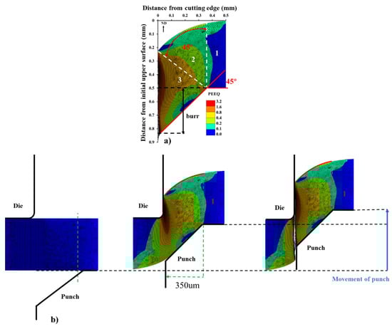 Area 1, about 350 µm away from the cutting edge, was a region with a negligible deformation. Area 2 was a bent region with medium deformation. The bent angle was about 45°, and the maximum width of the surface was about 0.35 mm. This indicates the formation of a bent area depends on the wear degree of the punch tools. The plastic deformation of area 2 was mainly concentrated in the middle—near area 3—and on the upper surface. According to the simulation, area 2 was formed before fracture initiation with the bending effect between punch and die (Figure 6b). When punching continued, the distance between punch and die became small, the shear effect became more important and the fracture started. Area 3 was formed after the complete fracture (Figure 6b). The entirety of area 3 was rotated by 45° relative to the original orientation rather than being continuously curved like area 2, and the rotation angle corresponded to the chamfer angle.
