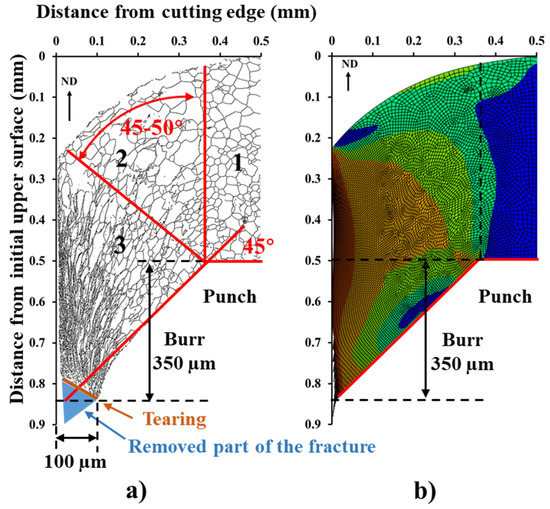 A bent cutting edge could be observed after punching with blunt punch tools according to the simulation (Figure 6a). From the cutting edge to the inner part, the zone about 500 µm wide was divided into three areas.
