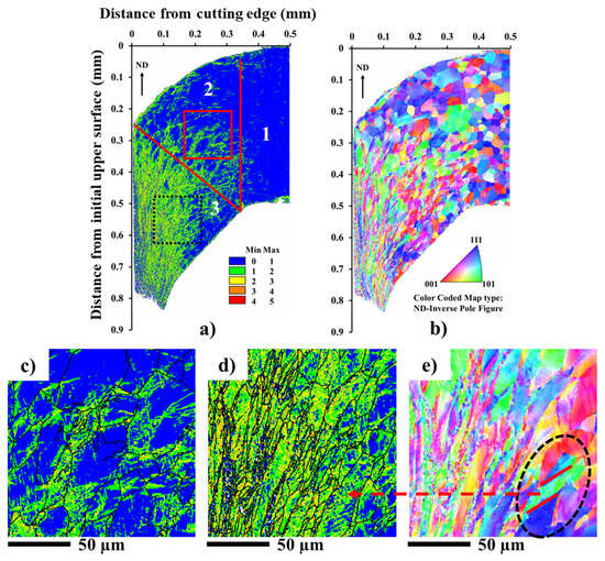 (a) KAM distribution map and (b) inverse pole figure (IPF) map obtained from EBSD analysis at the cutting edge of a punched sample; (c) KAM distribution map of red frame shown in area 2 of (a); (d) KAM distribution map; and (e) IPF map of black dotted frame shown in area 3 of (a). Black lines shown in (a,c,d) are the grain boundaries with misorientation greater than 15°.The black dotted circular frame and red lines in (e) show the presence of a shear band formed during punching.