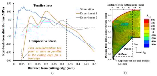The experimental and simulated distributions of residual stress are shown in Figure 9. The experimental results correspond to residual stress analysis by nanoindentation tests on the surface of punched sheet, and show good repeatability for the tensile stress distribution. Since the simulation was mainly focused on the longitudinal section of cutting edge, only the simulated residual stress in S11 direction on the surface of the cutting edge could be compared with the experimental results. The residual stress distributions of simulated and experimental results (Figure 9a) indicate the presence of tensile residual stress on the surface of the cutting edge after punching. The tensile residual stress was relatively weak with a maximum value about 100 MPa, which is consistent with the results of Mori et al. [4].