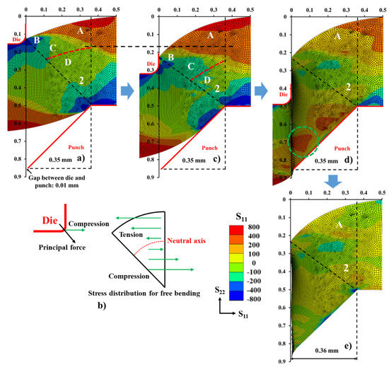 (a) Simulated distribution of residual stress in S11 direction at the beginning of punching. (b) Diagram of stress distribution for free bent area and the position near the contact between die and material. Simulated distribution of residual stress in S11 direction (c) during punching, (d) after fracture initiation and (e) after complete fracture and removal of mold. Number 2 indicates bent area 2. The letters A, B, C and D were used to distinguish the regions in area 2 with different states of residual stress. The dotted lines in (a,b) are used to distinguish the depth region A with tensile stress; the green dotted circle in (d) corresponds to the area with high tensile stress.