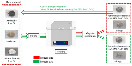 However, the experimental results show that the process has a low recovery efficiency of nickel and iron. Some researchers have studied the effect of accelerators on the reduction and polymerization of nickel and iron in the reduction of the roasting process of laterite nickel ore. Mainly sulfur-containing additives and sodium salt additives [11,12] have obvious effects on ferronickel recovery.