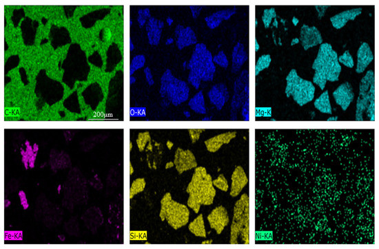 The chemical analysis and XRD pattern of laterite ore is shown in Table 1 and Figure 2. The ore contained approximately 0.82 wt. % of Ni and 9.67 wt. % of Fe. The main phases included serpentine, silica and iron oxide. In Figure 3, the occurrence of Fe and O elements in the raw ore indicates that Fe in raw ore exists in the form of iron oxides. The distribution of Mg, Si and O is highly consistent, and the aggregated particles are large, and is therefore considered as serpentine. The distribution of nickel elements is dispersive, but the relatively concentrated distribution of nickel elements in Mg, Si and O regions can be clearly observed. The TG/DSC of laterite ore are shown in Figure 4. It is a typical silicon magnesium laterite ore. The nickel content is approximately 1% and the iron content is less than 20% [2,12,16,21].