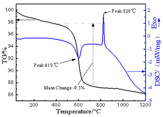 TG/DSC was used to determine the thermal properties of nickel laterite ore, as shown in Figure 4. It shows that the total weight-loss efficiency of the sample is around 12.7%. As a result of the endothermic and exothermic processes, two main peaks were observed in the DSC thermogram. The first main peak at 610 °C is the result of removal of the chemically bound water from the ore. The dehydration process is an endothermic reaction, the sample quality decreases slightly, and no phase transition occurs. The second main peak at 820 °C is the result of serpentine phase change from amorphous material to olivine phase with good crystallinity [22,23]. This phase transition process is an exothermic reaction, which was verified by XRD in previous experiments.